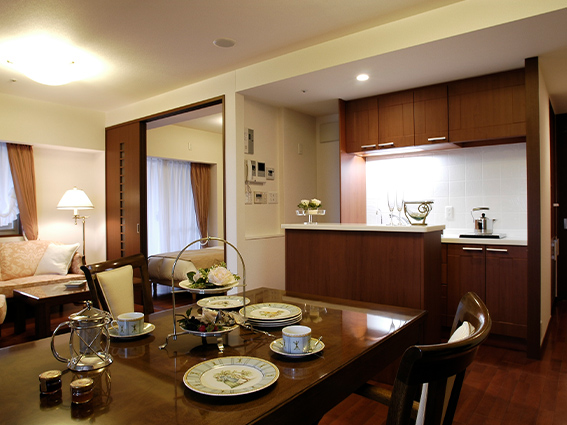 おひとりで住むなら十分な広さの39m²(1K)から、おふたりでも余裕を持って暮らせる83m²(3LDK)まで、ライフスタイルにあわせてお選びいただける6タイプのお部屋をご用意しました。壁や床の色調は、ぬくもりのあるライトベージュと、落ち着きのあるダークブラウンの2タイプをご用意しております。室内はすべて引き戸を採用し、車椅子での移動も考慮し廊下などの空間を広く取るなどユニバーサル設計を徹底しました。