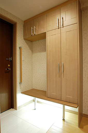 玄関には座って靴を履いていただけるよう腰かけを設けました。