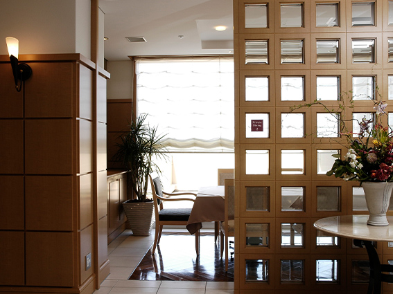 エントランスホール中央の吹き抜けからは開放的でやわらかな陽射しがこぼれ、自然の素材を中心としたインテリアをさらに格調高く演出します。その落ち着いた雰囲気の中で、ゆったりと寛ぎながら歓談や読書などのひとときをお楽しみください。